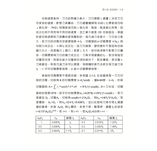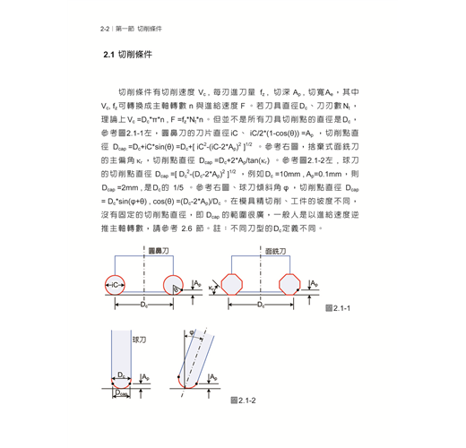 第二章,銑削刀具學:模具精切削所使用的刀具大都是球刀,在加工業所使用的刀具種類有很多,而刀具幾何則與加工效率、刀具壽命大有關係。本章主要重點在於整理有關銑削實用技術,包括定性觀念與計算公式,其中所包含的細部知識,可以用於應用技巧的發揮,甚至成為進階上的必要基礎。例如刀具幾何與切削顫振關係密切,是研讀第三章的基本知識。