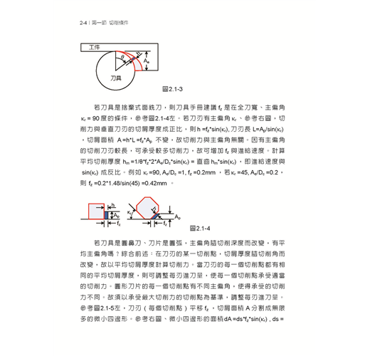 第二章是銑削刀具學。個人在刀具學的認知,全部來自刀具商知識與刀具手冊,尤其是國外高階刀具商的技術手冊內容豐富。國內刀具手冊偏向採購規格,僅簡單扼要列出大概的切削條件,可能是保守參考值,並非實驗數據。選擇刀具廠牌時,除了考量價格外,應重視無形價值的技術支援。好的技術服務可以提高切削效率與刀具壽命,對於切削疑難雜症,即使不能解決、至少可提供有效正確的方向,減少盲目的試誤法。畢竟我們遇到的切削問題大多是普遍的,刀具大廠都有研究與處理經驗,正是我們最需要的知識。本章主要參考的刀具廠有Sandvik, Seco等,尤其Sandvik的切削技術最豐富與實用,Seco有出一本切削理論書,適合學者研究參考使用。
