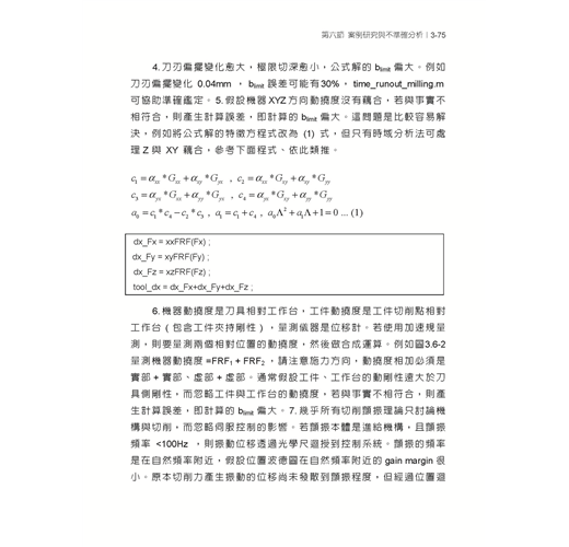 第一章是模具精切削技術研究,綜合CAM路徑、機構動剛性、伺服控制等關鍵因素,做深入分析。建議先研讀《工具機應用設計》的第1、2章。過去切削技術給人的印象是經驗法則,沒有太多理論與計算。個人一直認為所有技術釐清之後,就是基礎理論...