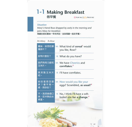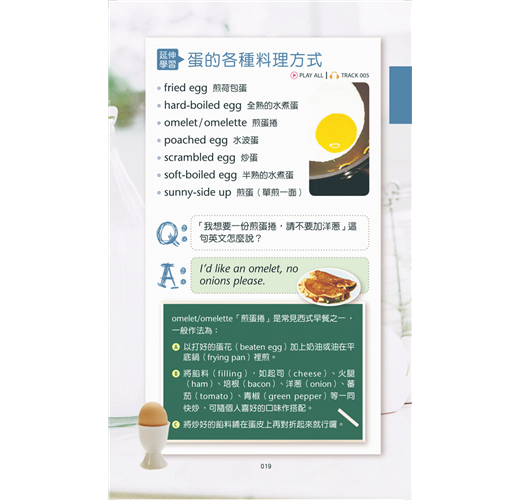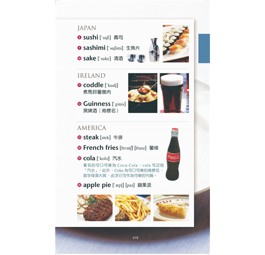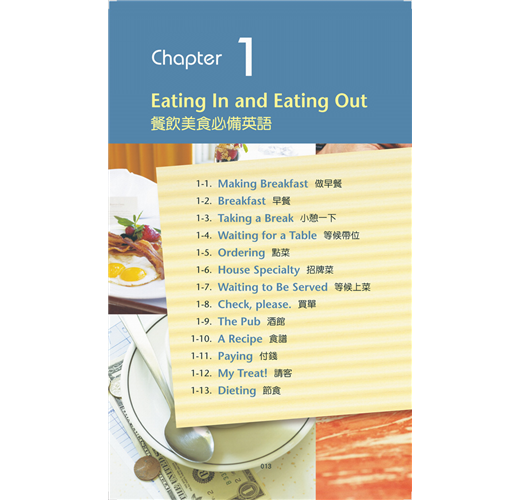 本書一開始就要帶您進入餐飲美食的英語饗宴,教你讀懂菜單,學會點菜、買單等的必用句。接下來,購物時想詢問店員尺寸、又或者買的衣服需要修改,你會用英語說嗎?另外,到國外唸書或短期租房子時,有哪些問題需要和房東溝通呢?出國搭乘交通工具、看病拿藥、銀行開戶、存提款,還是心血來潮想到美容院弄個頭髮,你都知道怎樣用英語去應付這些狀況了嗎?
