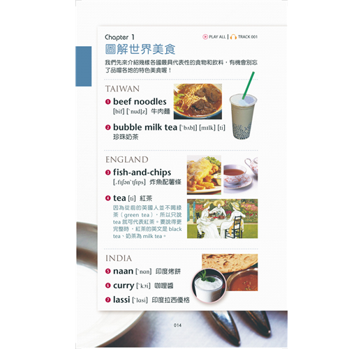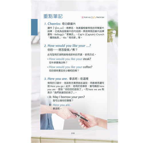 本書分成了「餐飲美食必備英語」、「衣著服飾實用英語」、「住宿英語沒問題」、「英語暢行無阻」、和「日常生活英語通」共五大主題,包含 58 篇的實用情境對話,讓讀者一窺老外們平時對話用語的技巧;另外有近 600 個重點字彙及用語,提供更為精闢的說法給讀者們參考使用。每篇情境對話之後還有 58 篇延伸學習,詳細解說片語與慣用語的用法。而本書的 30 個實物圖解,更搭配了許多國外的實景實物照片或生動的插畫,讓你學英語不再只是憑空想像、索然無味地背誦詞彙,而能彷彿身歷其境一般地學習真實生活中的必備英語。