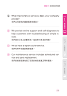 Our maintenance service includes scheduled service and parts replacement. (我們的維修服務包括了定期的檢查維護及零件置換。)