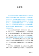 風格是寫作的人都必須講究和下功夫學習的。《風格的要素》這本書簡明易懂,是學習英文寫作的人極佳參考書。譯者畢業於長榮大學翻譯研究所,翻譯的功力極佳,樂為推薦。