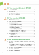 MIT App Inventor 的相關功能都有介紹,包括:程式邏輯所需的拼圖塊、 各種不同用途的元件(User Interface 元件、Layout 元件、Media 元件、 Drawing and Animation 元件、Sensors 元件、Social 元件、Storage 元件、 connectivity 元件),但不含LEGO® MINDSTORMS® (控制樂高機器人)元 件。