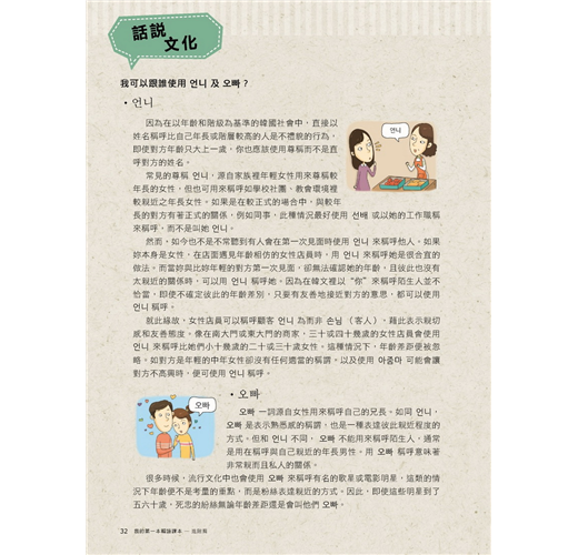 有些俗語/慣用語聯想一下便容易理解,如「눈이 빠지다(望眼欲穿)/목이 빠지다(引頸期盼)」,或是「눈치가 없다(沒眼力)/눈치를 채다(察言觀色)/눈치를 보다(看臉色)」等,但有些俗語/慣用語單看字面卻無法直接意會,如「바가지 쓰다(被坑) VS 바가지 씌운다(坑人)」。如果單純只學語言而不瞭解韓國文化,遇到俗語/慣用語時除了死背硬記之外別無他法,背一背隔沒多久便把東西還給老師也是常有的事。甚至鑽牛角尖一點的人,會覺得這句話的中文明明就跟韓文八竿子打不著關係,為什麼會是這個意思?因為無法理解所以久久都記不住那句話的意思。本書每一課最後面都有一個單元叫「話說文化」,分別針對韓國文化進行解說,讓大家可以多了解一些韓國當地文化,用理解的方式來記誦俗語和慣用語。如此一來不僅能提升語文能力,還能增廣見聞,讓讀者用有趣的方法學韓文。