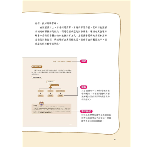 在版面設計上,本書採用簡單、清楚的學習界面,配以四色圖解來輔助解釋複雜的概念,利用已經成型的財務報表,讓讀者更快地瞭解書中介紹的各種知識和數據計算方式,方便讀者更快地掌握和用好必備的財務指標,快速瞭解企業財務狀況,提升資金的利用效率,提升企業的財務管理效能。