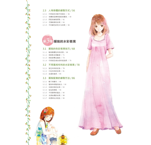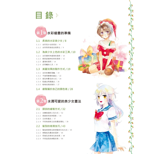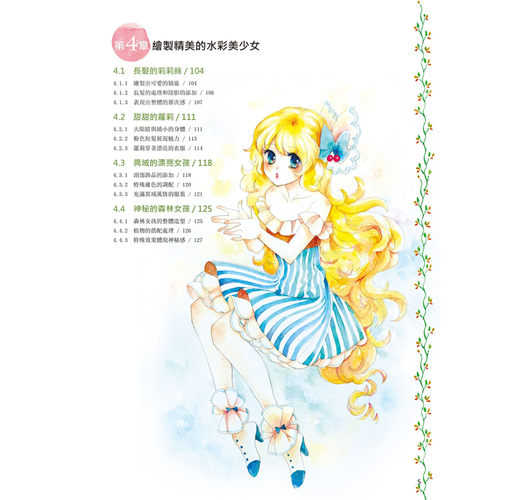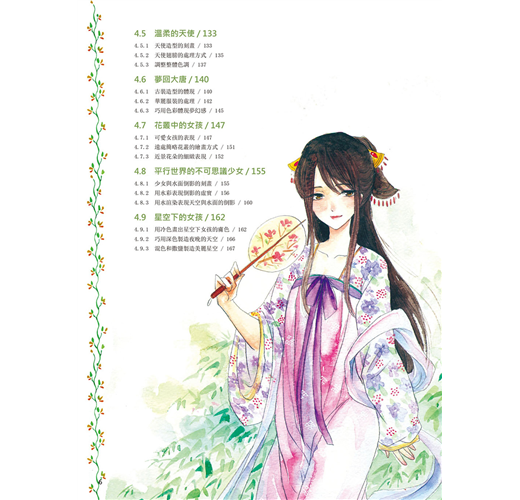 本書共分為4章。第1章是水彩繪畫的準備,介紹了水彩畫的特色和工具,以及各種特效的製作方式。第2~3章是美少女水彩畫的具體繪製方法,分別講解美少女的頭部、髮型、身體和服裝的繪製方法及表現技巧。第4章以9種類型的美少女為例,讓你領略不同風格的美少女風采,同時練習並綜合運用前面所學的各種技法。