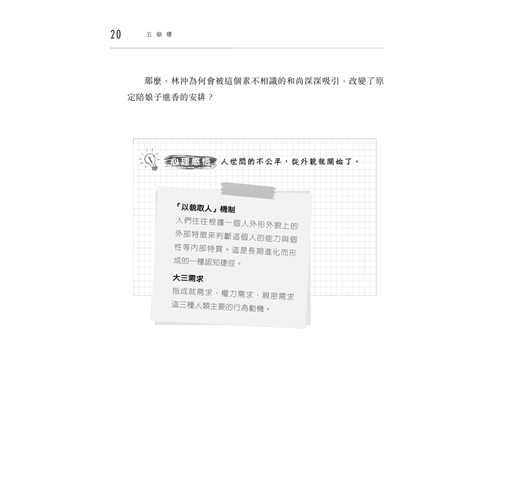 但是,因為「內向者應激偏好」,他對外在情境反應敏感;過高的「自我監控能力」,又易受他人影響而約束自我言行,在魯智深、武松眼中不值一提的外在威權,對林沖卻有強大的壓迫。