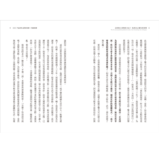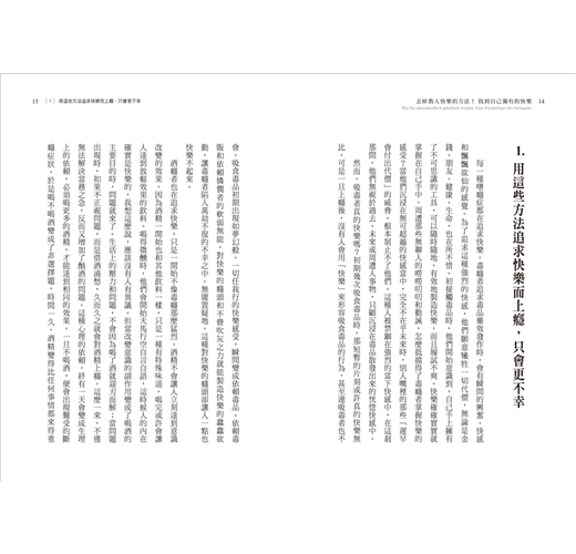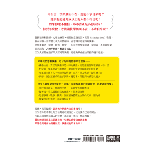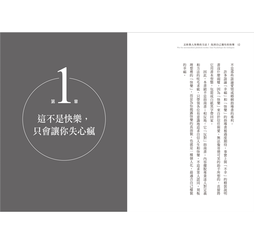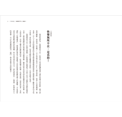 因此,本書絕不是指導書;相反地,它「反對」指導書,內容擺脫專業達人對定義和方法的吹毛求疵,只帶領各位有意識地追求自信人生和快樂。不追求眾人認同,刻板理想裡的「快樂」,而是為你揭露快樂的真面貌,也就是一種個人化,最適合自己樣貌的幸福。