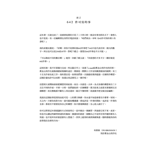 這本「書」,成書於一天之內,充滿了實驗精神與出人意料的創意軌跡。有一天,舊金山寫作社成員布朗森(Po Bronson)的一位作家朋友突然提議做一本書,叫《642件可寫的事》。於是,布朗森便向舊金山寫作社(一個擺滿獨立寫作隔間的實體空間)的35名成員發出邀請,一起腦力激盪。結果不到一小時,便湧進百來個題目。那天結束,已經累積了五百個題目。第二天午餐時間,布朗森就把完稿交給編輯。