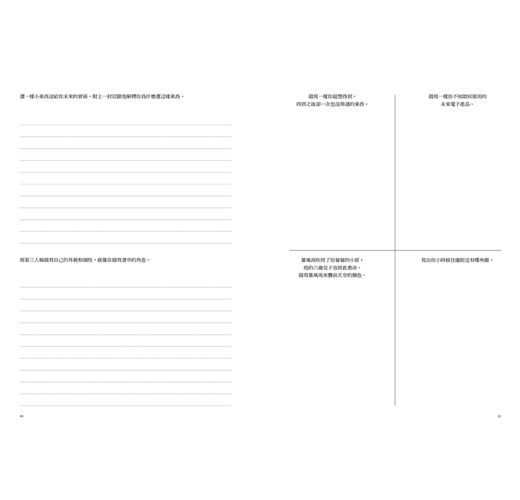 讀者可以隨意翻開一頁、挑選一個題目來發揮,也可以連續接受一道道題目的刺激。遇到創意瓶頸時,可提醒自己,一定還有東西沒被寫過,一定還有創意點子可想。