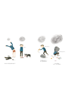 安娜・華克用黑色鋼筆線勾勒輪廓,並借著灰色的鉛筆線增加烏雲的效果,她運用透明水彩上色、渲染,有些區域,她用色紙和紗布……。經過不同媒材混合而成的畫面有一種清明、安靜的氣氛,讓讀者感覺到陰天均勻的光線和潮濕的空氣。故事的開始與結尾都是陰天的早晨,但是男孩抱持的態度卻使得一切截然不同