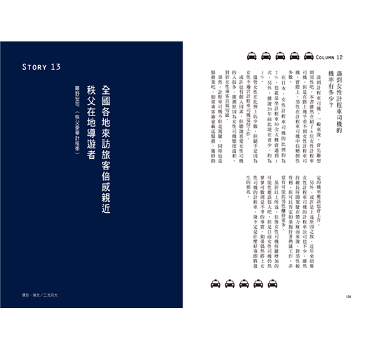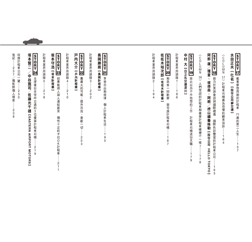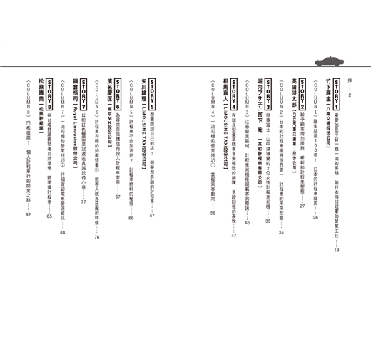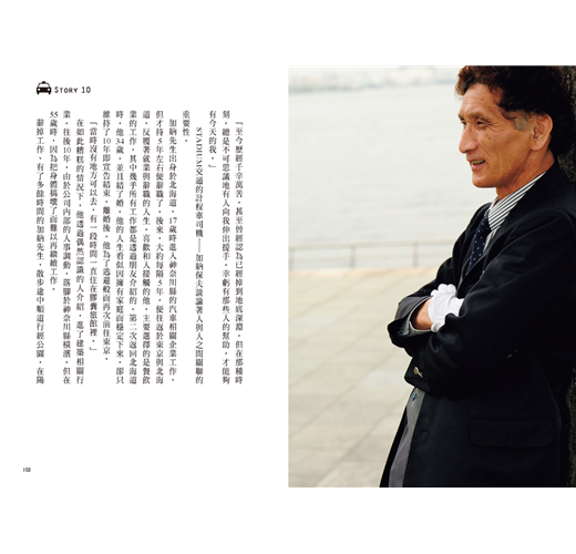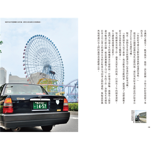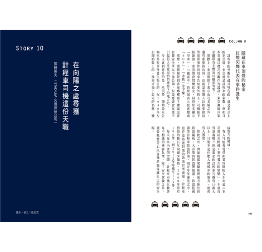 馬路上計程車來來往往,在火車站、捷運站、醫院等許多地方也能夠看見一輛一輛正在排班的計程車,計程車已經融入我們的日常生活,可能有人會覺得計程車司機不過就是普通人,有什麼好談論的呢?然而,有時候搭上計程車,和司機聊天之後,才意外地發現原來有些計程車司機們也是臥虎藏龍、見多識廣並擁有許多精采的人生故事,本書中即有多位閱歷豐富的司機。另一方面,就因為計程車貼近你我的日常生活,計程車司機如同一般大眾,日日勞碌奔波,以求三餐溫飽。書中各篇主人公,有些人為了自己的興趣,有些人為了撫養家庭,有些人為了尋找自己存在的意義,有些人探索自己的夢想,內容反映現實生活,正如你我市井小民為了自己的生命而奮鬥,搭配書中光影優美的照片,如同一幕幕的清新日本電影片段,讓人讀了愛不釋手。