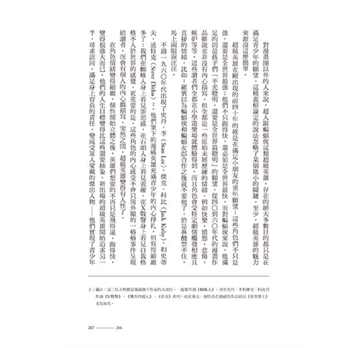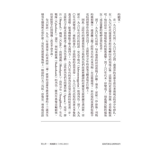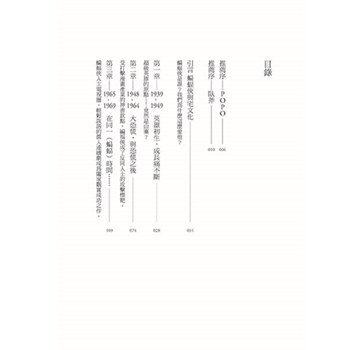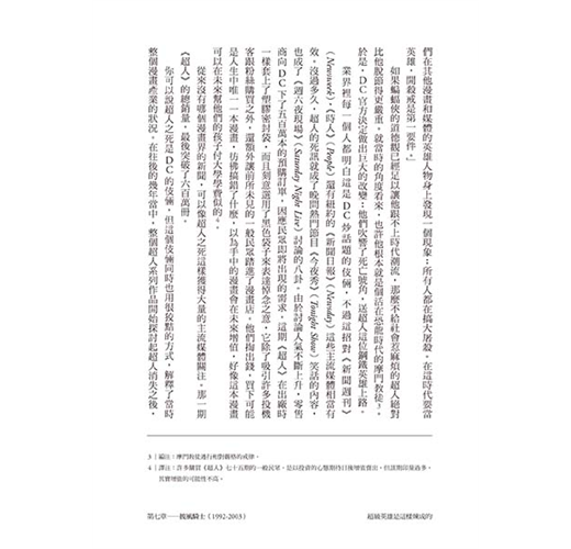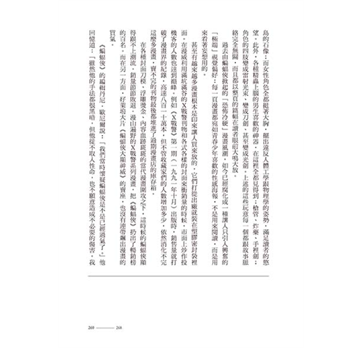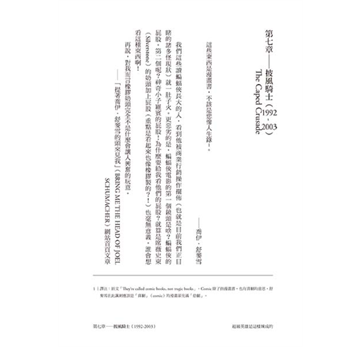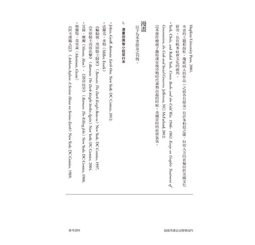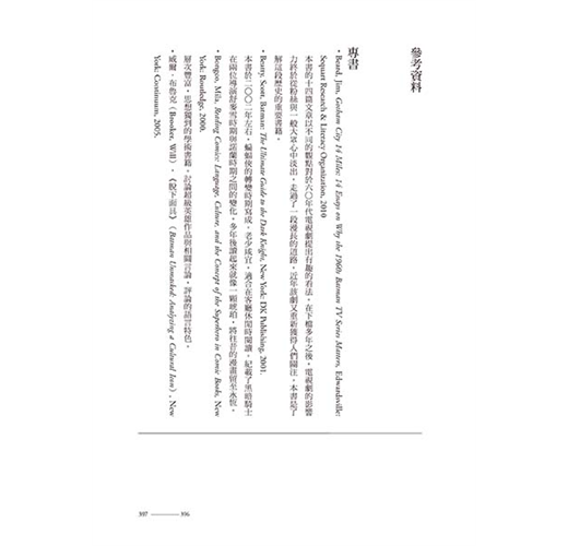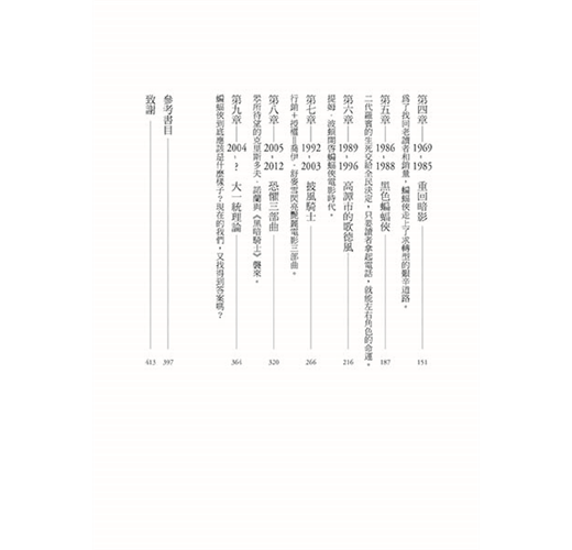 這本書堪稱蝙蝠俠文化百科,任何細節都不放過。厲害的是,雖然內容龐雜,作者卻整裡得很清楚,讀者在吸收蝙蝠俠這些錯綜複雜的歷史相關知識之虞,也能藉此理解美國娛樂文化的整體演變。畢竟蝙蝠俠已經是歐美娛樂文化的指標之一,他個人品牌的演變就是社會風氣的縮影,因此要把這本書當作美國娛樂發展史也不為過。