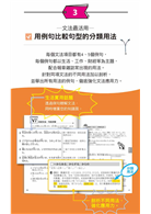 每個文法項目,都帶出4、5個例句,每個例句都以生活、工作、財經等為話題,甚至是報章雜誌常出現的用法。另外,針對同項文法的有不同用法加以剖析,並舉出不同分類用法的例句,有助於強化文法應用力。