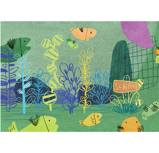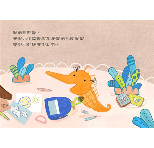 海馬小花期待已久的開學日終於到來了,但是她的同學和老師看起來很不友善。河豚同學是個臭臉王,不想說話時就會把身體鼓脹成一顆長滿刺的球;烏賊同學有起床氣,生起氣來會胡亂噴出黑黑的墨汁。還有嘴裡長著尖牙的鯊魚老師,看起來也好嚇人,小花究竟要怎麼和他們和平共處呢?