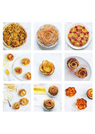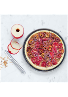 規則:將條狀蘋果片捲起來,放在塔派中央處,再將其他條狀蘋果片捲起,放在中央的第一個蘋果捲旁邊,直到擺滿塔皮做成大型蘋果塔為止。