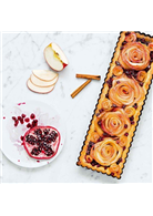 規則:將條狀蘋果片捲起來,放在塔派中央處,再將其他條狀蘋果片捲起,做成玫瑰花苞形狀。再製作其他玫瑰花苞狀的蘋果片捲,直到擺滿塔皮做成大型蘋果塔為止。