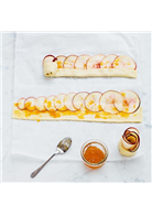 規則:將水果切成小薄片條狀,在麵皮上刷上果醬,全部一起捲起。