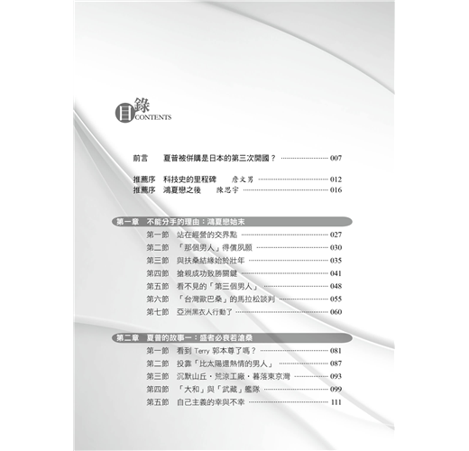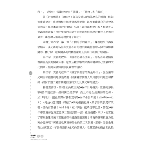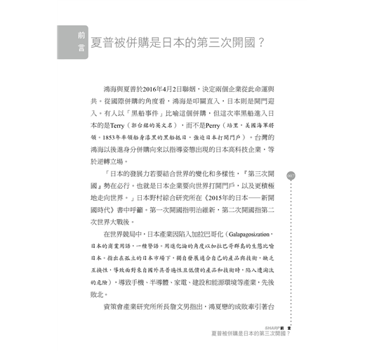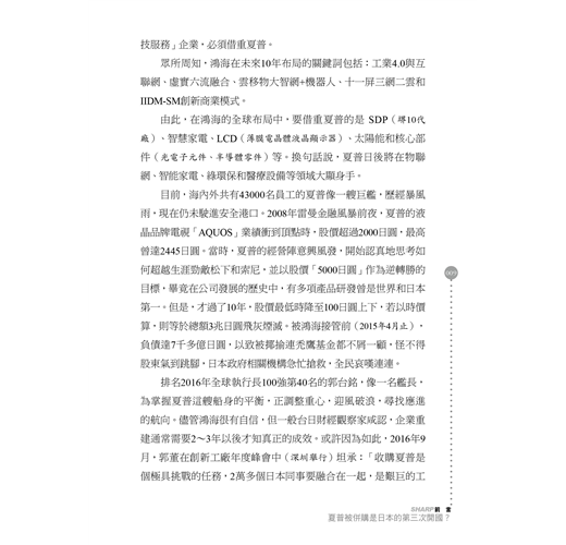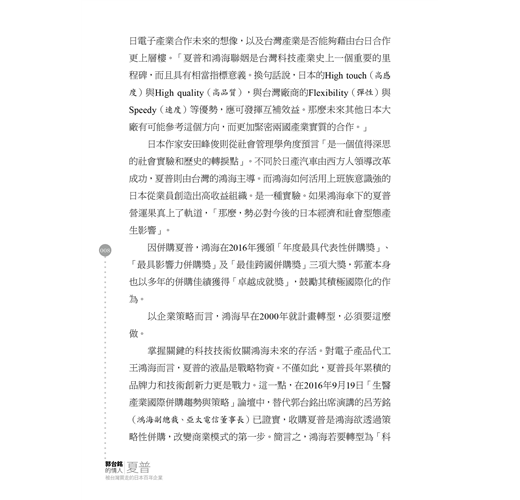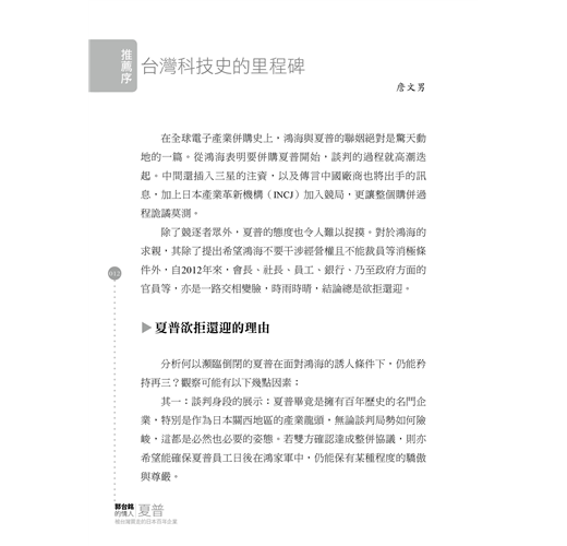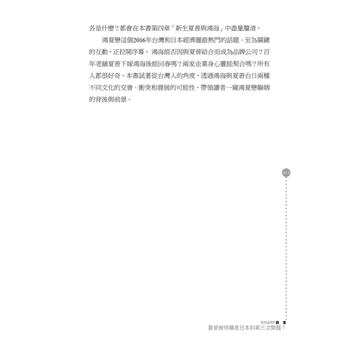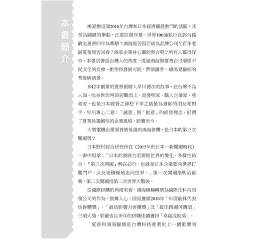 鴻夏戀這個2016年台灣和日本經濟圈最熱門的話題,其至為關鍵的舉動,正要拉開序幕。世界100強執行長郭台銘窮追夏普四年為哪樁?鴻海能否因而成為品牌公司?百年老舖夏普能否回春?兩家企業身心靈能契合嗎?所有人都很好奇。本書試著從台灣人的角度,透過鴻海與夏普台日兩種不同文化的交會、衝突和發展可能,帶領讀者一窺鴻夏聯姻的背後與前景。