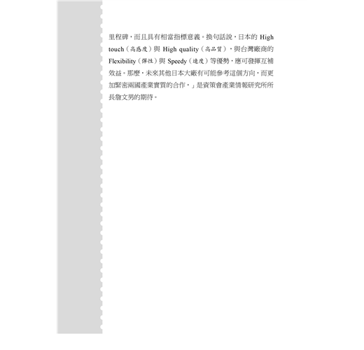 「夏普和鴻海聯姻是台灣科技產業史上一個重要的里程碑,而且具有相當指標意義。換句話說,日本的High touch(高感度)與High quality(高品質),與台灣廠商的Flexibility(彈性)與Speedy(速度)等優勢,應可發揮互補效益。那麼,未來其他日本大廠有可能參考這個方向,而更加緊密兩國產業實質的合作,」是資策會產業情報研究所所長詹文男的期待。