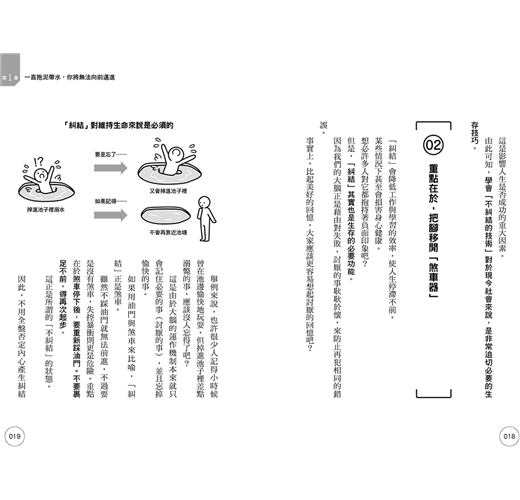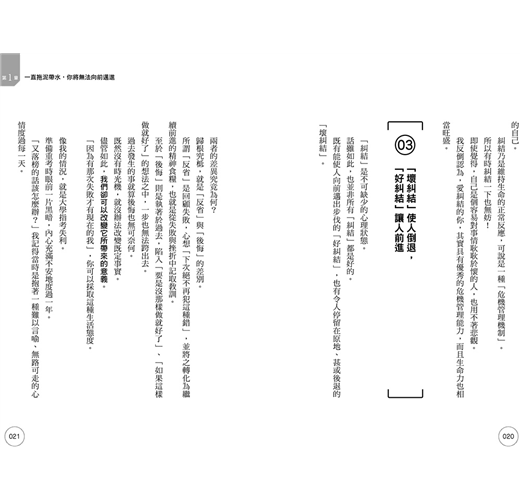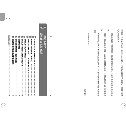 現代社會變化快速,在複雜的環境下,要求成果的傾向越來越強烈。想在社會中生存,不能老是愁眉不展、裹足不前,應該儘早重新振作,此時就需要「不糾結的力量」才能繼續向前。