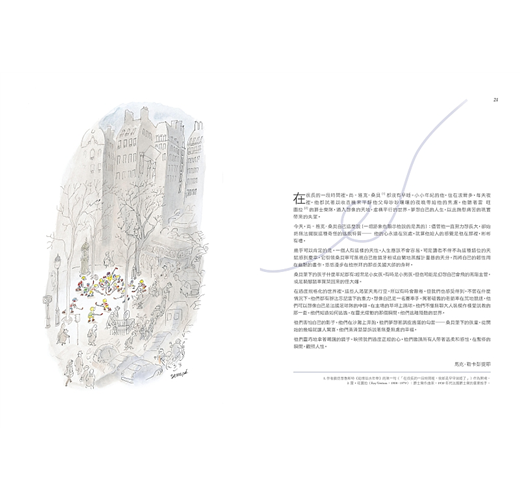 但這一切並未讓桑貝變得憤世嫉俗,也不擁抱教條。他從來不怪父母,知道他們盡力了,生活不容易。他想盡快賺錢回家,化解家裡的暴戾之氣,於是他打酬勞很低的零工,他畫單幅幽默畫、跟朋友合作加上文字。漸漸的,地方報紙、雜誌願意刊登;漸漸的,他的畫作帶他離開波爾多家鄉,走向《紐約客》封面及其他報刊版面,觸探世界各地讀者深層的記憶,喚醒最恆常的溫柔。