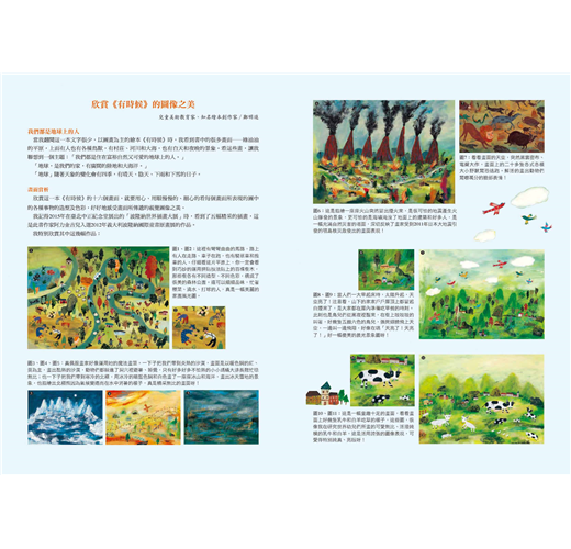 書中的插畫不只描繪自然、生靈與時間,她亦將祈願自然的永續以及欣欣向榮的心願都顯現出來,藉由繪畫來傳達對自然環境議題保護的省思和期盼能引起社會大眾重視環境議題,更多的是希望你我都能夠珍惜並把握此時此刻,我們所擁有的一切。