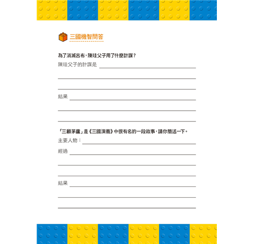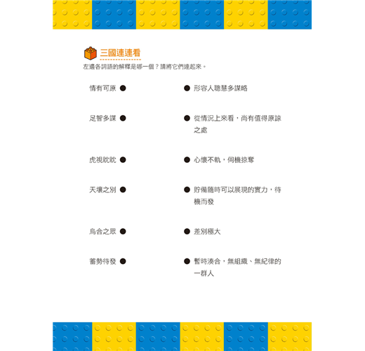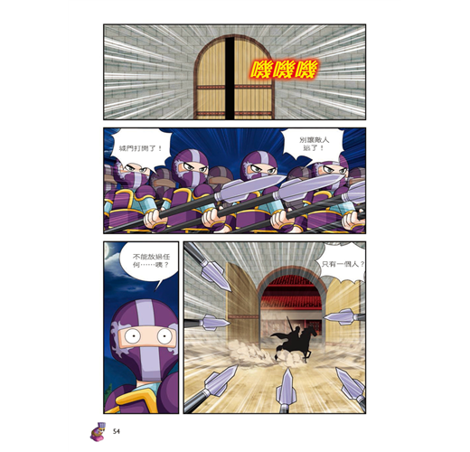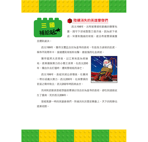 ‧ 不一樣的知識含量:隨頁補充對話中的經典成語或名言,並且設置「三國補給站」小單元,詳細介紹三國人物及時代背景,讓小朋友的語文能力和歷史常識都UP!UP!