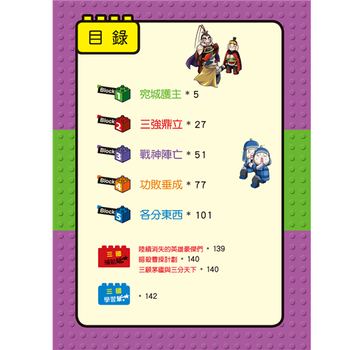 ‧ 不一樣的人物造型:帥氣瀟灑的三國英雄變身為Q版可愛的積木人,生動的外形與鮮明的性格,讓小朋友印象更深刻!