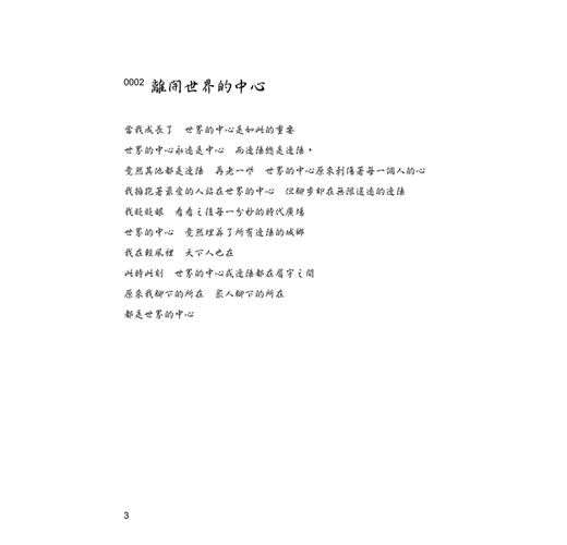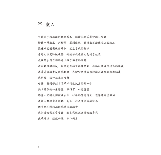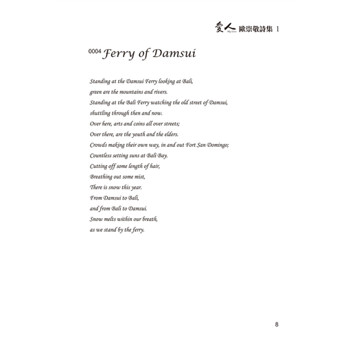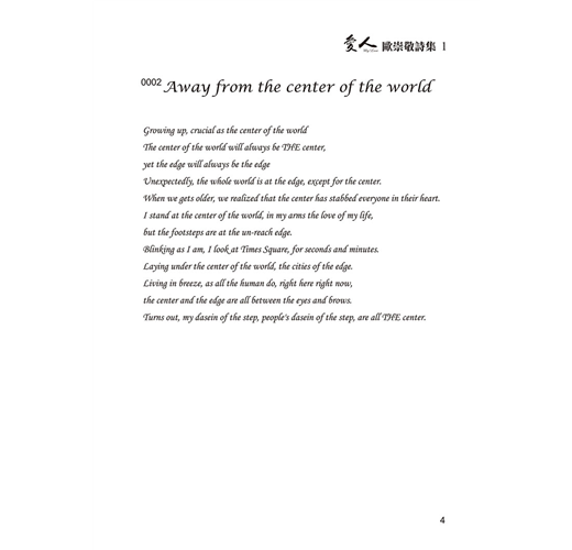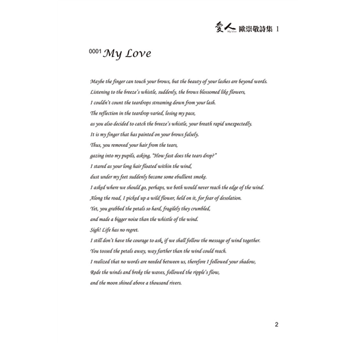 每本詩集封面紙採用一種單色印刷,每一首中文詩就對應一首英文詩,作者也是我自己,只是英著同步作者多了兩位。