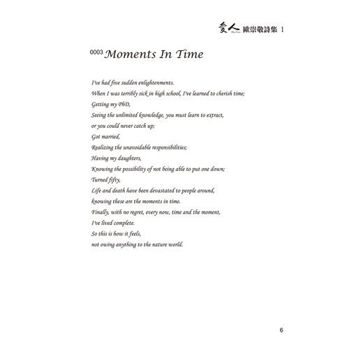 個人專著出版了五十多種,自己都是唯一作者。過了五十歲,想起了書房裡從年輕17歲開始寫的兩千多首新詩文稿,順手整理再寫了寫,同步再與兩個女兒英譯,成了新的家庭聚會形式。