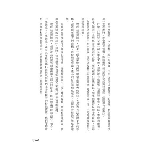 行銷在以前完全是一個系統化工程,想實現有效銷售必須要有廣告、通路、客服和銷售,以及公關等一系列專業手段進行合作。而現在卻只需要粉絲,如果你擁有足夠多的粉絲,全部工作都能透過網絡平台來實現,運作過程甚至只需要幾個人就能完成。這一手段的背後推動力就是粉絲經濟。