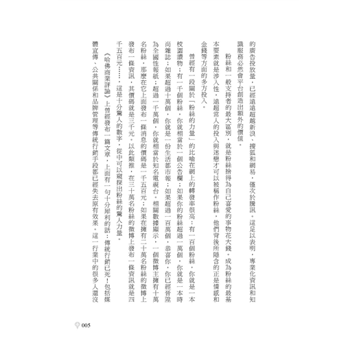 曾經有一段關於「粉絲的力量」的比喻在網上的轉發率很高:有一百個粉絲,你就是一本校園讀物;有一千個粉絲,你就相當於一個公告欄;如果你的粉絲超過一萬個,你就是一本時尚雜誌;如果超過十萬個,你就是一份生活都市報;如果超過一百萬個,恭喜你,你已經晉陞為全國性報紙;超過一千萬個,你就相當於知名電視台。相關數據顯示,一個微博主擁有十萬名粉絲,那麼在它上面發布一條消息的價碼是一千五百元;如果在擁有二十萬名粉絲的微博上發布一條資訊,其價碼就是三千元。以此類推,在三十萬名粉絲的微博上發布一條資訊就是四千五百元︙︙,這是十分驚人的數字,從中可以窺探出粉絲的驚人力量。