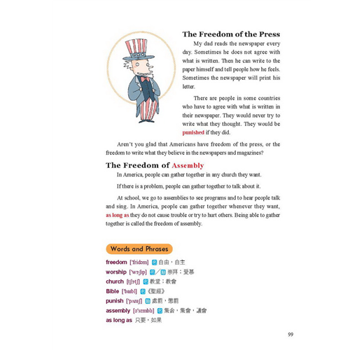 此書先由自然科學篇開始,這部份的文章寫得非常好,包括寬廣的宇宙、肉食植物、地球、滅絕的恐龍等。社會篇則涵蓋了美國人的生活和歷史,這讓讀者更深入的了解美國文化。歷史篇則讀者/學生可以透過這些好文章,知道美國內戰、兩次世界大戰、以及經濟大蕭條等發生的重要緣由。