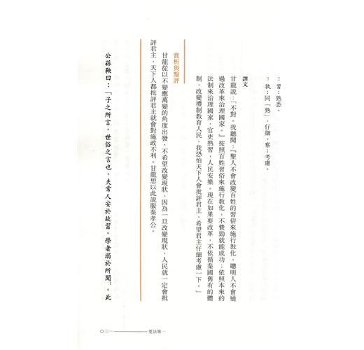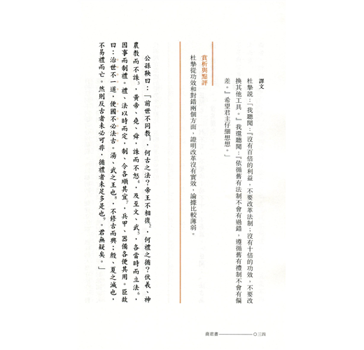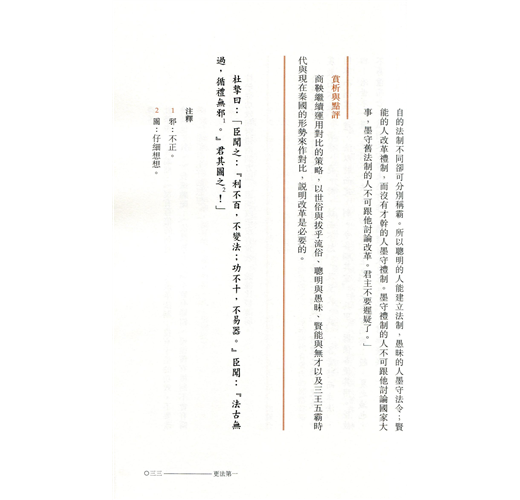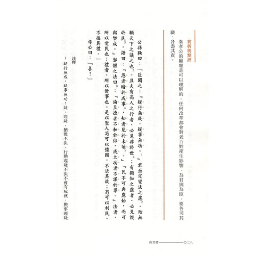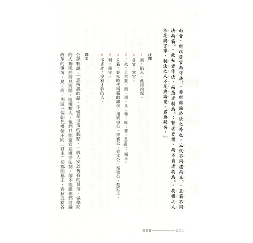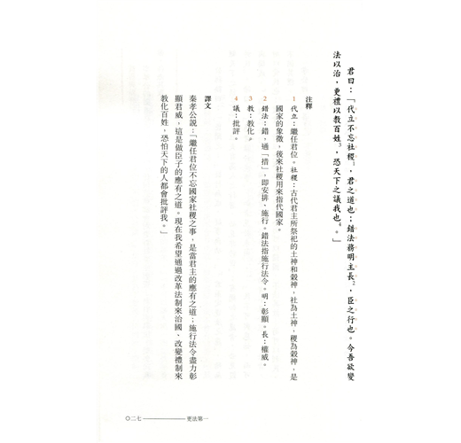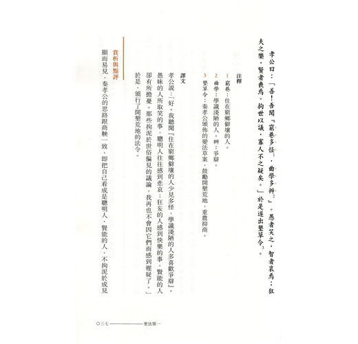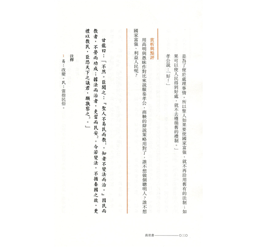 《商君書》所談及的治國原則、策略與方法,與現代管理亦有相通之處。是書雖然主要着墨於國家事務,面向的讀者對象卻不僅限於帝王。書中涉及的政府立法、行政等,對執法官員也是適用的,可釐清管治的內涵,以實現有效管理。閱讀《商君書》即可了解古代中國人的管理思維和整個管理體系在國家政治中的落實。