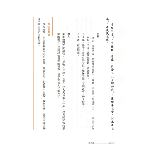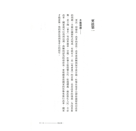 《商君書》是戰國時期法家學派的代表作之一,該書解决了在當時條件下實行變法的理論基礎問題,提出了變法的幾大原則,既有宏觀理論闡述,也有具體的法令軍規。