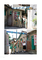 家駿穿了一身吊嘎仔、短褲,腳踩木屐,引領著大寶、狗子,和行動略有不便的方台生,從屋外經過時,裡頭正放著激情快板音樂《今天不回家》。