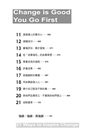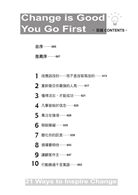 本書輕薄,攜帶方便,書中提供領導者21個方式,來激發改變他們的組織 。每篇都有一個主題,並搭配生動勵志的插圖,簡單又易讀,激勵團隊(或是個人)走出舒適圈,開始擁抱變革。