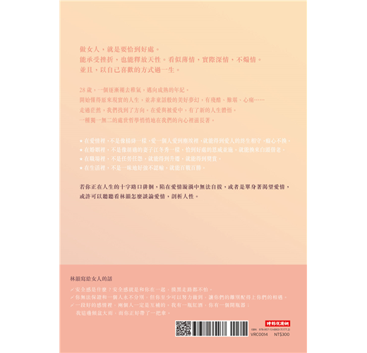 書中一則又一則的愛情故事,林韻用犀利的筆觸,道出看似遙遠,卻不斷在歷史中輪迴,現實中上演的人性糾葛──什麼是複雜,什麼是簡單;什麼是誘惑,什麼是機會。