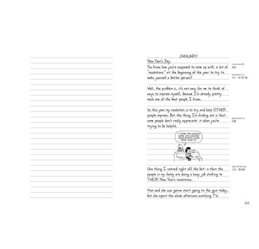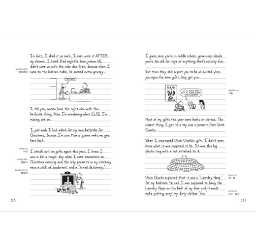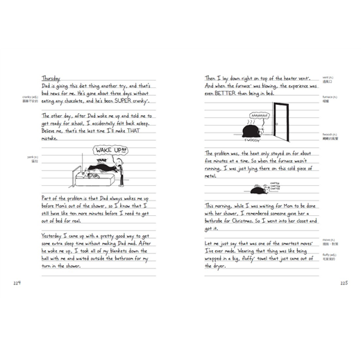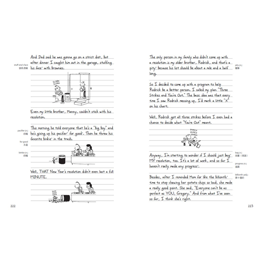 在最最重要的譯者人選方面,我們推敲再三,最後選定由胡培菱老師擔綱。胡老師平常就關注出版生態,文筆絕佳;再加上旅居美國多年,深入了解美國生活習俗和用語,可說是不二人選。其次是版面。這系列之所以大受青少年歡迎,是因為作者嘲諷、直率的筆調,栩栩如生的呈現青少年無所適從的心情,完全擊中年輕讀者的認同點。在新版本中,我們先看中文,希望回歸作者初衷──藉由閱讀陪伴青春期孩子度過這段色彩繽紛卻又糗事連連的歲月。英文原文淺顯易懂,搭配逗趣插圖,就像在看短篇的漫畫,無形中大大增強學習英文的動機。因此我們將英文部分重新編排,附在中文譯文之後。希望讀者在哈哈大笑之餘,也能收到英文練功的奇效。