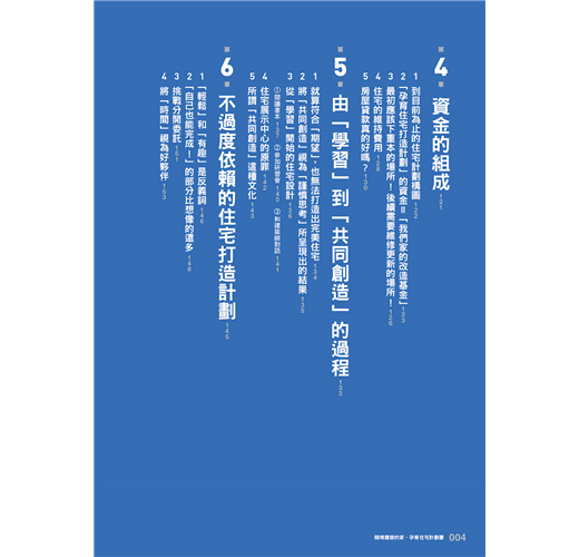 在第4章當中,將對於從新居到改造的資金準備,以及資金的組成做出詳細的說明。住宅設計並非由「委託」開始,而是從「自己學習」當作起點。從「學習」中的自問自答,找出對於自己而言住宅必要的條件,接著再和建築師一起「共同創造」,這種過程是非常重要的。第5章將論述關於設計的進行方法。
