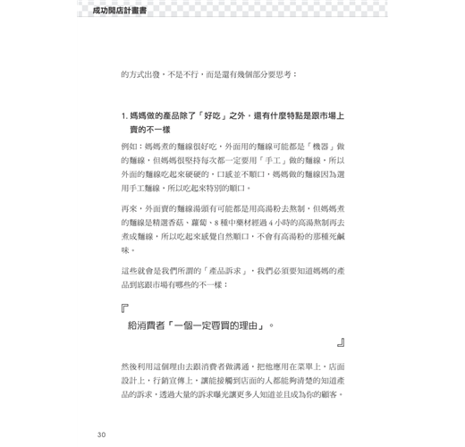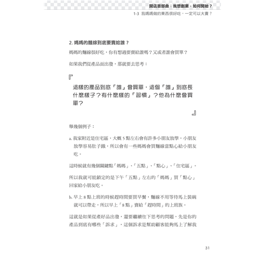 本書最令我敬佩的是,全部都是實戰經驗,是小關創業十年經驗累積出來的教戰手冊,,而沒有空泛的理論,並提供實際的表格讓你照表操課,從商業機會的探索、產品需求與定價、資金財務管理、網路和門市的數據化營運等。