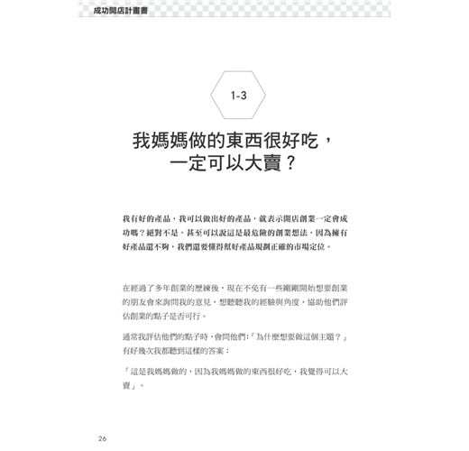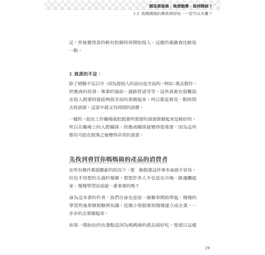 這是一本給想創業、想開店的朋友的「實戰計畫書」,作者本身就是從微型創業走到全台連鎖店的真正創業者,從作者的成功與失敗經驗裡,歸結出實務經驗、總結重要問題,並且在這本書中提供具體的解決辦法。