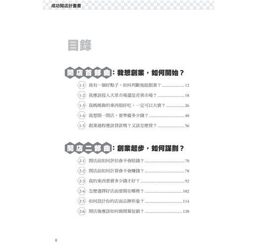 透過此書讓你了解開店創業每個階段會遇到的問題,以及解決問題的具體方法,從創業前的點子企劃、準備中的店面選擇、開店後的營運計畫,都用真實的案例搭配具體的策略步驟,帶你上手開店創業的每一個流程。