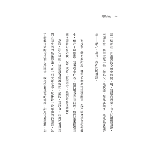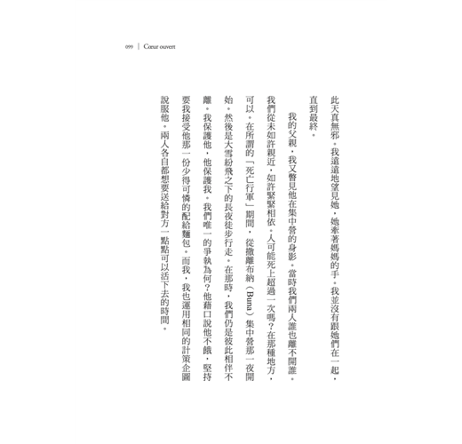 「打開的心臟」成為身為人與信仰者的信念隱喻。他回顧無法言說的過往,集中營裡相伴不離的父親、妹妹牽著母親時的面容,以及婚姻、孩子、孫子女帶來的生命禮物。對於寫作、教學、公眾事務,對於記憶與倖存者,他做的足夠嗎?他不斷詢問上帝,將引領他往何處?人類是否還有希望?