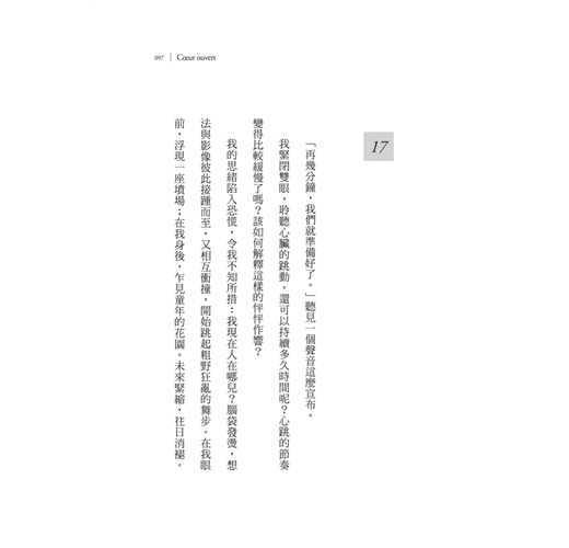 說也奇怪,我在那個時候,全然感受不到真正的不安。通常來說,我這個人比較屬於性格焦慮、做事戰戰兢兢、情感脆弱、思想悲觀的人。我並沒有心跳加快,我的呼吸正常,而且也沒有任何疼痛。身體毫無任何一絲病兆。連警報訊號也沒有。畢竟,我不是才在三天前做完了「體檢」嗎?一系列完整、深入的檢查,包含所有可以想像得到的測試,心電圖也是其中一項,都是由向來照護我的診斷醫師所指定的項目。然而,這同一位醫師,現在卻叫我趕緊上醫院報到。沒有任何病徵顯示我有冠狀動脈方面的病症:我既無胸痛,也沒有胸悶的感覺。在我的身體裡面,到底有什麼東西忽然產生變化,才使它失去穩定狀態?