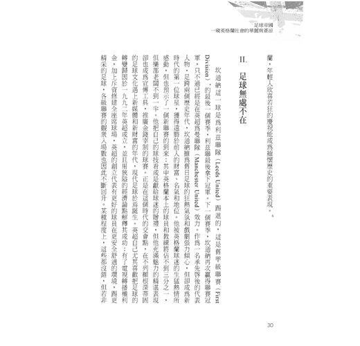 三月,正是乍暖還涼的時節,郵箱裡捎來編輯學妹的信函,邀我替大衛.哥德布拉特(David Goldblatt)所著的《足球帝國:一窺英格蘭社會的華麗與蒼涼》寫篇導讀。這書名讓我直憶起自己在碩士論文當中引述的一句話,出自美籍的文化史家巴森(Jacques Barzun, 1907-2012):「誰要是想透徹瞭解美國,最好先去學習棒球,學習它的規則,還有關於比賽的一切。」足見若能善用運動這一面明鏡,便能直視一個社會、民族,或者國家的核心。