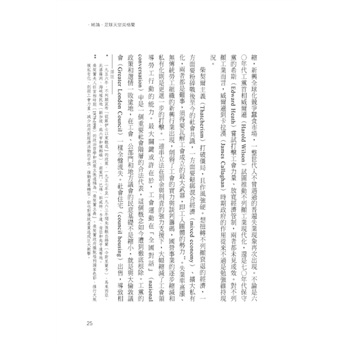 工業社會的不列顛,同樣步上帝國後塵,淹沒在歷史浪潮之下。這時期的不列顛在特恩布爾和希利眼中一定不陌生,甚至在他們對談的同時,去工業化的漫長過程已然展開。一九六○年代開始,產品與就業市場從製造業逐步轉型成服務業,伴隨而來的是國內階級結構、文化與政治方面的劇烈變化,到了一九七○年代,變化的腳步更快。不列顛工業萎縮,新興全球化競爭蠶食市場,一整世代人不曾遇過的普遍失業現象再次出現。不論是六○年代工黨首相威爾遜(Harold Wilson)試圖推動不列顛工業現代化,還是七○年代保守黨的希斯(Edward Heath)嘗試打擊工會力量、放寬經濟管制,兩者都未見成效。對不列顛工業而言,威爾遜到卡拉漢(James Callaghan)時期政府的作用從來不過是勉強維持現況。