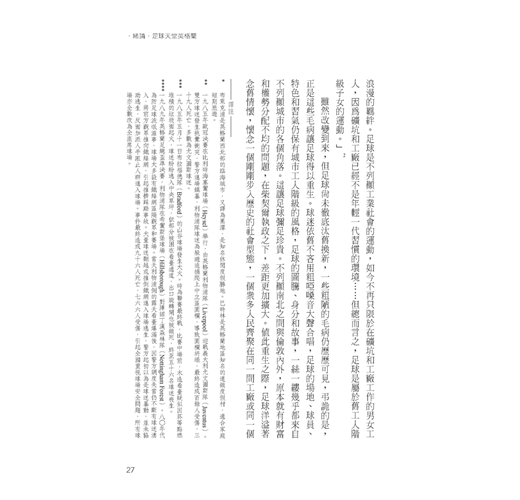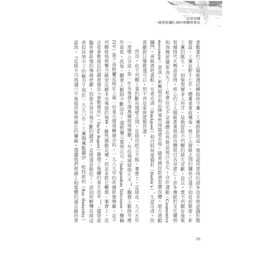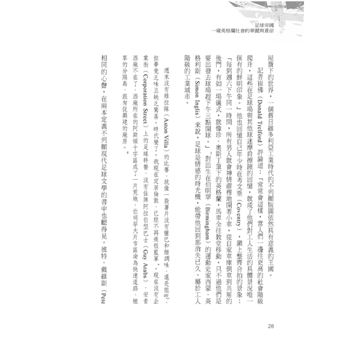 我無法界定這本書屬於那一個類別,只能說他是一本不屬於運動類別的運動書籍,你可以說這是一本英格蘭的歷史學讀本,也可以說是一部英格蘭的經濟學指南,或是地理手冊,甚至童話繪本,從最基礎的歷史軌跡,到英格蘭的產業結構變化,一直到英格蘭人內心深處的民族認同、心靈焦慮,甚至是性別教育、種族歧視等問題,如同一場激烈而精彩的足球比賽,有狂喜、有哀愁、有高潮、有低落,酣暢淋漓也同時氣喘如牛,只是在還來不及回味精彩的過程時,已驀然驚覺這就是我們的社會,甚至我們的人生歷程,而下一場比賽也早已迫在眉睫。
